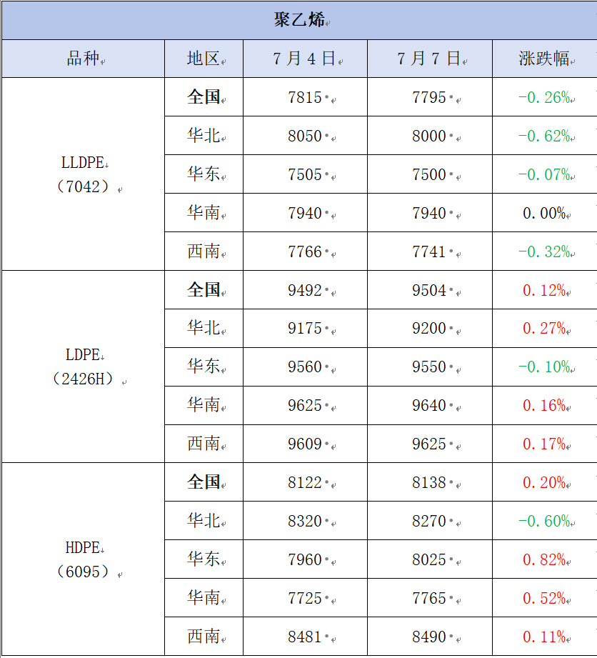 今日,聚乙烯市场弱势整理,价格涨跌互现。LLDPE(7042)市场价格为7795元/吨,较上一工作日下跌20元/吨,跌幅为0.26%;LDPE(2426H)市场价格为9504元/吨,较上一工作日上涨12元/吨,涨幅为0.12%;HDPE(6095)市场价格为8138元/吨,较上一工作日上涨16元/吨,涨幅为0.20%。OPEC+加大增产力度施压油价,国际原油价格下跌,成本支撑松动。市场缺乏进一步提振,市场交投难有起色,聚乙烯厂家大多降价出货,市场心态偏空,价格调整为主。